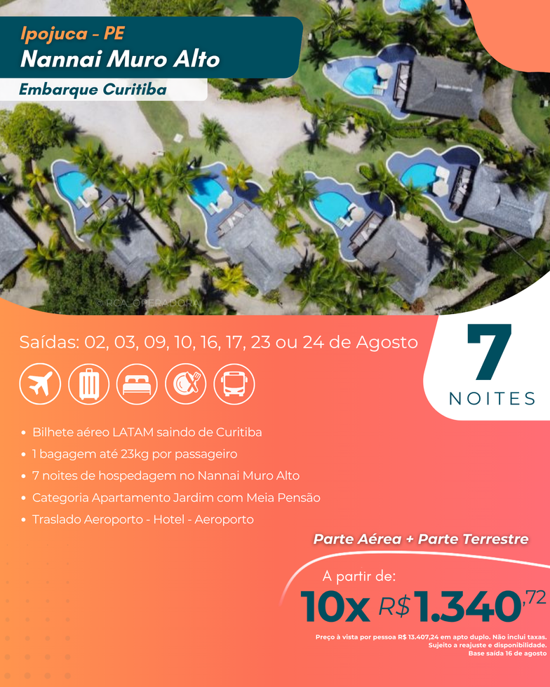 🌴 Já imaginou passar 7 noites em um dos resorts mais exclusivos do Brasil, com embarque direto da sua cidade?
