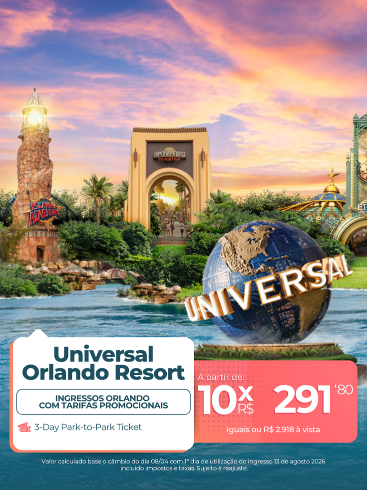 Nossos pacotes incluem: Ingressos selecionados para Walt Disney World Resort, Universal Orlando Resort ou United Parks & Resorts com condições especiais de parcelamento 🎟 + Benefícios exclusivos como All-Day Dining GRÁTIS em opções selecionadas 🍽