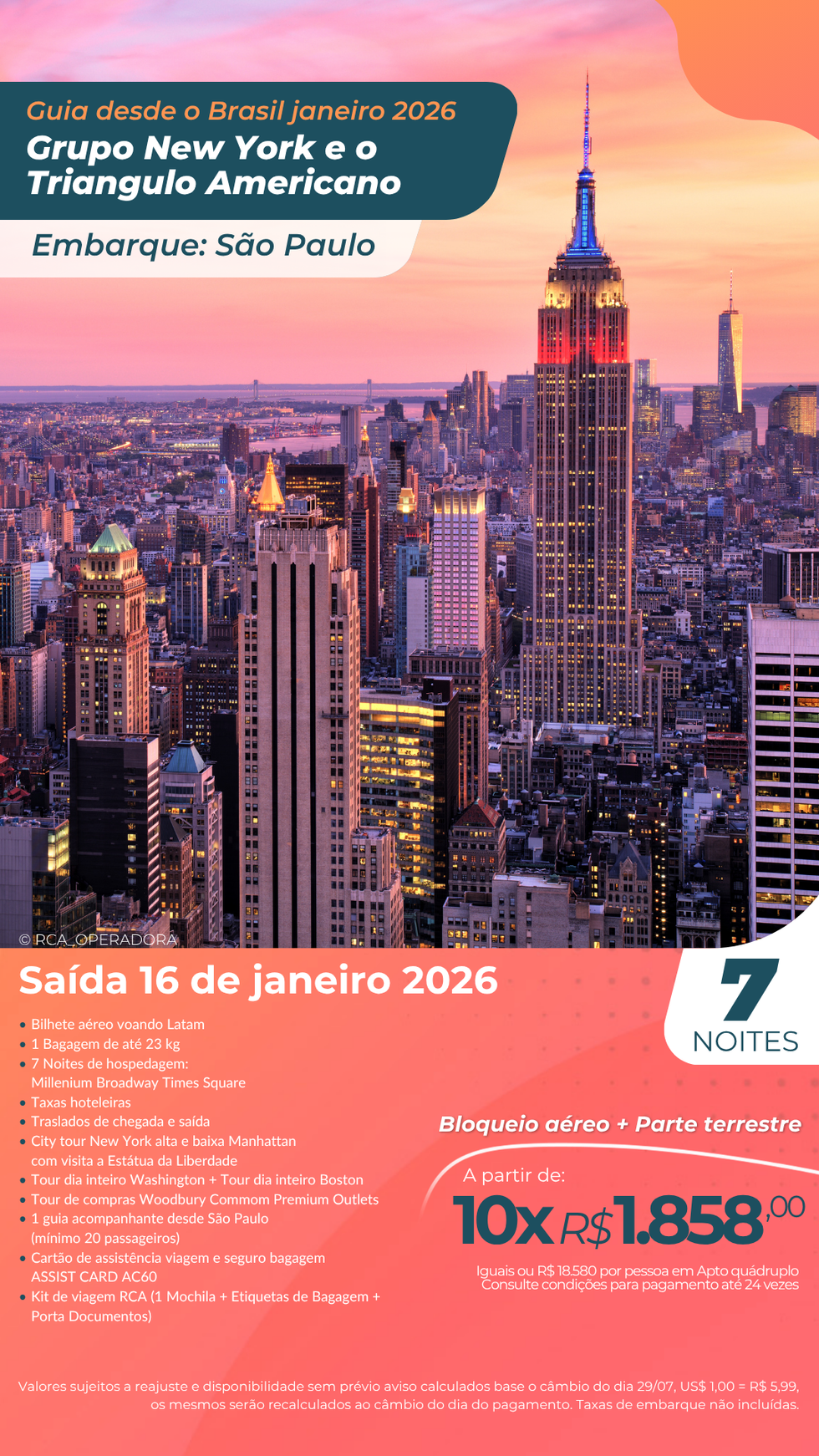 Tarifas imperdíveis, com passagem AMERICAN AIRLINES✈ com 1 mala 23kg 🧳+ 7 noites no hotel Millenium Broadway Times Square, taxas hoteleiras + Traslados de chegada e saída🚌 + City tour New York alta e baixa Manhattan com visita a Estátua da Liberdade🗽 + Tour dia inteiro Washington + Tour dia inteiro Boston + Tour de compras Woodbury Commom Premium Outlets🛍 + 1 guia acompanhante desde São Paulo (mínimo 20 passageiros) + Cartão de assistência viagem e seguro bagagem ASSIST CARD AC60 + Kit de viagem RCA (1 Mochila + Etiquetas de Bagagem + Porta Documentos)!
