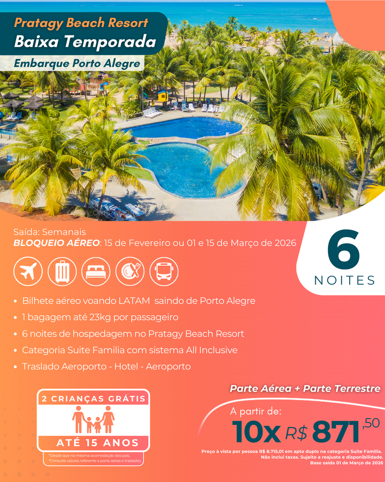 Garanta sua viagem para um dos resorts mais completos do Nordeste, com bloqueio aéreo garantido, sistema All Inclusive e vantagens exclusivas para famílias.