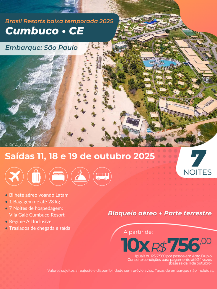 Nossos pacotes incluem: passagem aérea saindo de São Paulo ✈ com 1 mala 23kg🧳, 07 noites de hospedagem 🛏, all inclusive 🍽 e traslados de chegada e saída 🚌.