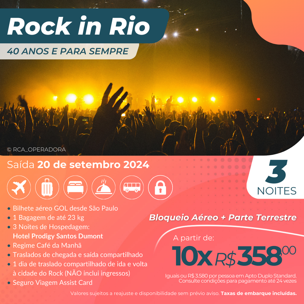 Nosso pacote inclui: passagem aérea desde São Paulo ✈ com 1 mala 23kg🧳, 03 noites de hospedagem no Hotel Prodigy Santos Dumont 🛏, com café da manhã 🍽, Traslados de chegada e saída compartilhado + 01 dia de traslado compartilhado de ida e volta à cidade do Rock (não inclui ingressos)🚌 e Seguro Viagem Assist Card.