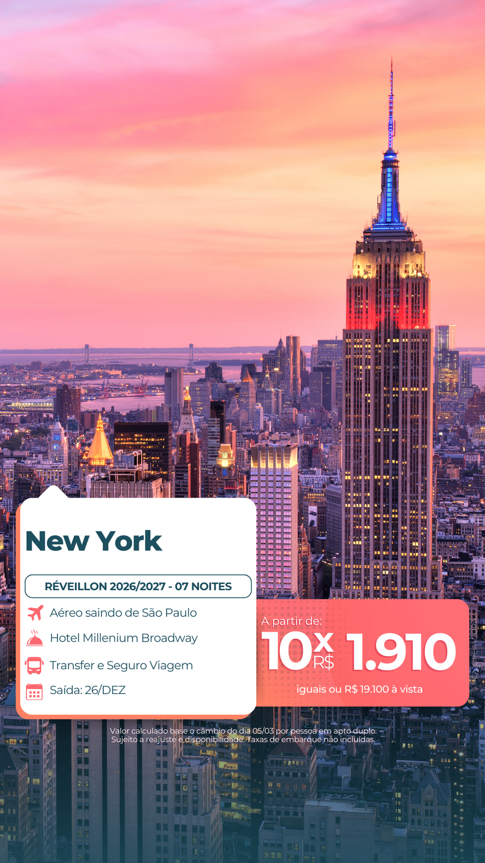 Seja para ver a bola descer na Times Square ou para celebrar com os fogos mágicos da Disney, nossos pacotes de Réveillon 2026/2027 para os Estados Unidos já estão prontos para garantir que o seu cliente comece o ano com o pé direito (e o passaporte carimbado)! ✈🇺🇸